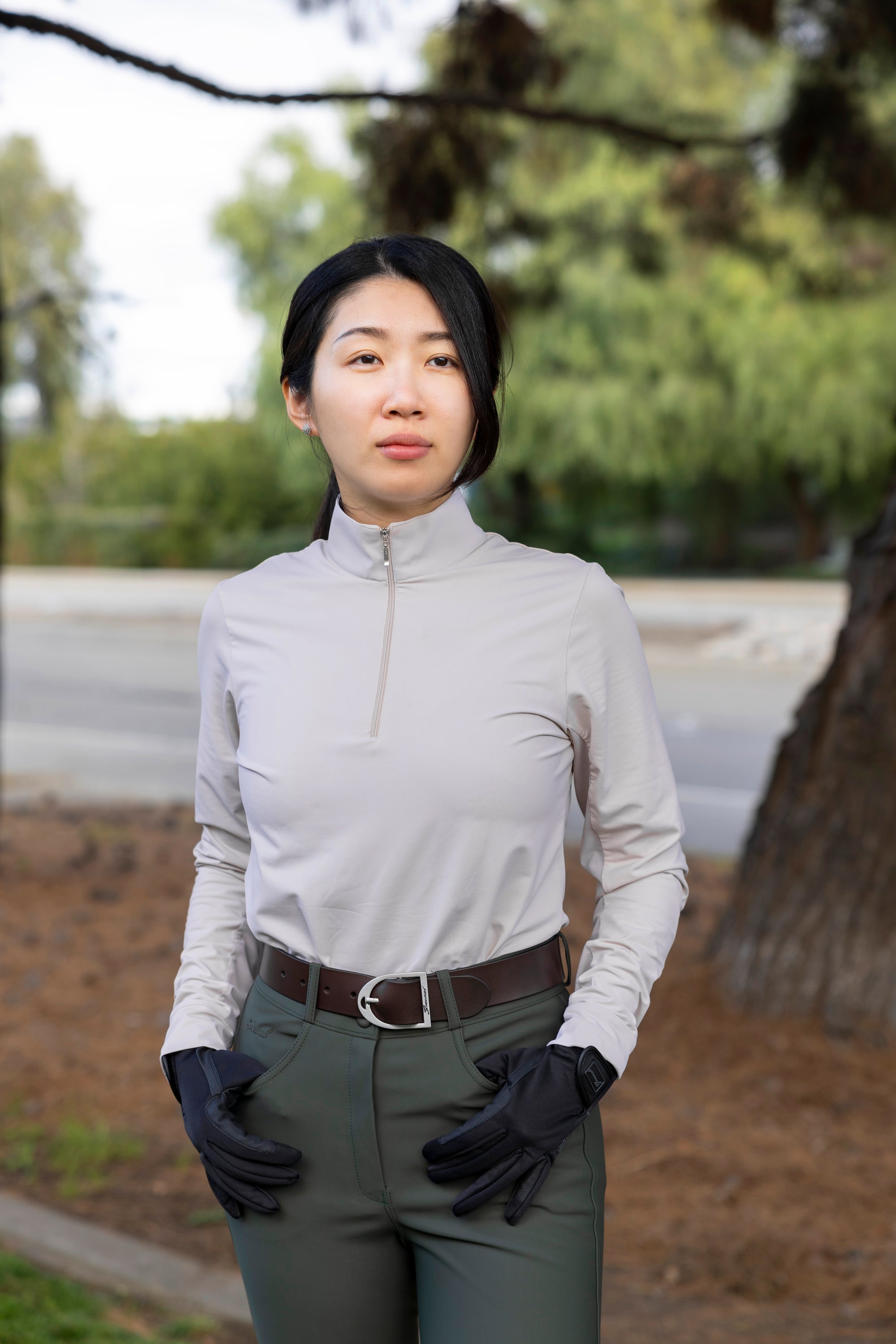Woman wearing a turquoise equestrian top and white pants standing in an outdoor setting.